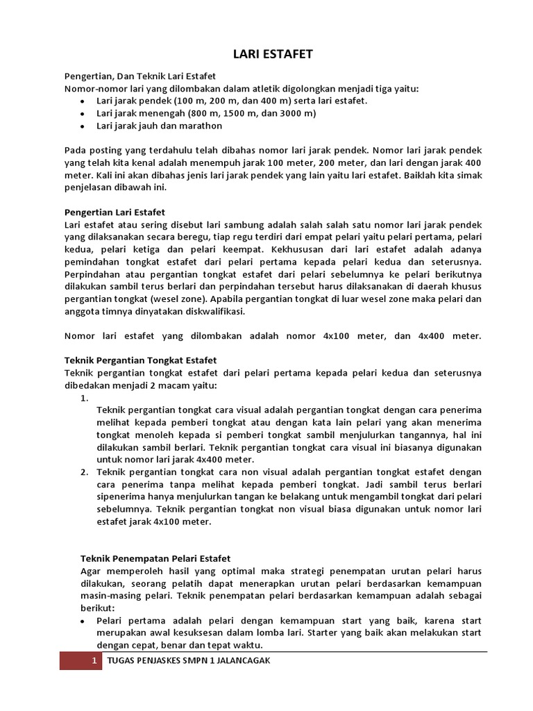 104683387 Makalah Lari Estafet Pdf Document from demo.fdokumen.com Kemampuan yang harus dimiliki oleh pelari kedua dalam lari estafet adalah. Pada saat menerima tongkat estafet, maka penerima harus menjulurkan tangannya ke. Ketika menerima tongkat estafet, maka penerima harus menjulurkan tangannya ke …. Cara pemindahan tongkat estafet yang si penerima tongkat tanpa menoleh ke belakang dinamakan cara. Teknik untuk menerima tongkat dibagi menjadi dua jenis yaitu visual dan non visual. 3 ketika menerima tongkat estafet, maka penerima harus menjulurkan tangannya ke. Pada saat menerima tongkat estafet, maka penerima harus menjulurkan tangannya ke …. Cara pemindahan tongkat estafet yang si penerima tongkat tanpa menoleh ke belakang dinamakan cara ….